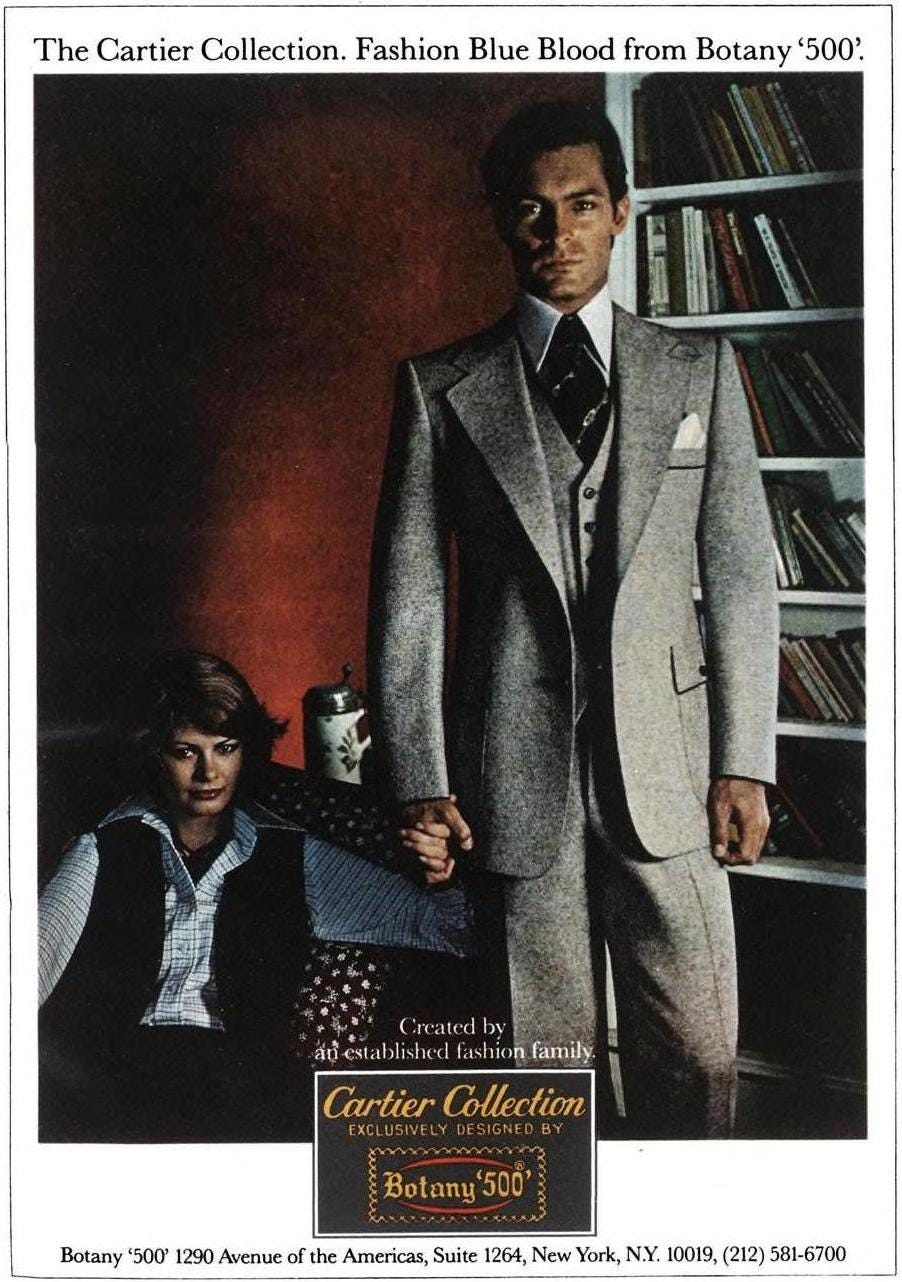 From a Fabric Ad, Esquire Magazine, 1977: A man wearing a three-piece at home holding hands with his woman, possibly expecting guests.